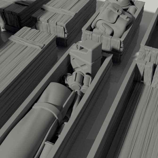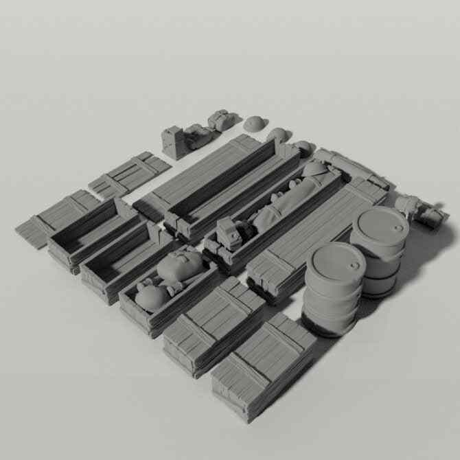 Crafted with the utmost attention to detail, each piece in this set is a miniature marvel. The set of stowage items for your Grim tanks. Set includes; 2 barrels, a bedroll, a rolled tarp, 2 create designs with optional lids and contents, 1 large crate design with optional lid and contents, 3 helmets, 1 jerry can, 2 back packs, 1 potato masher, 1 quad-potato masher.