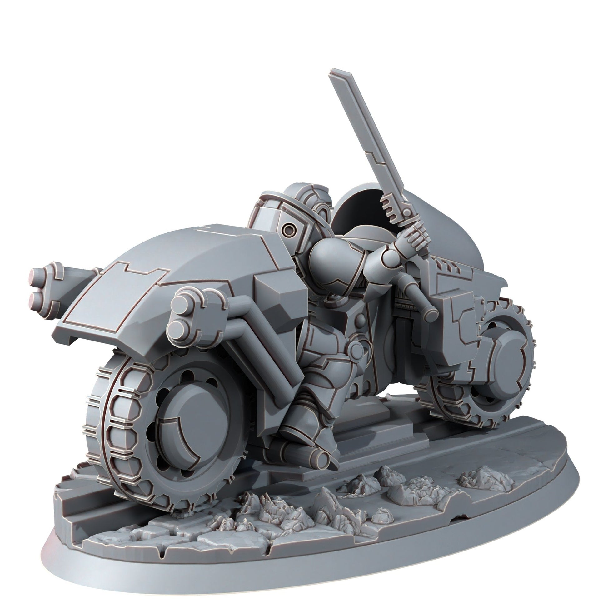 - Detailed combat bike and armored rider miniatures
