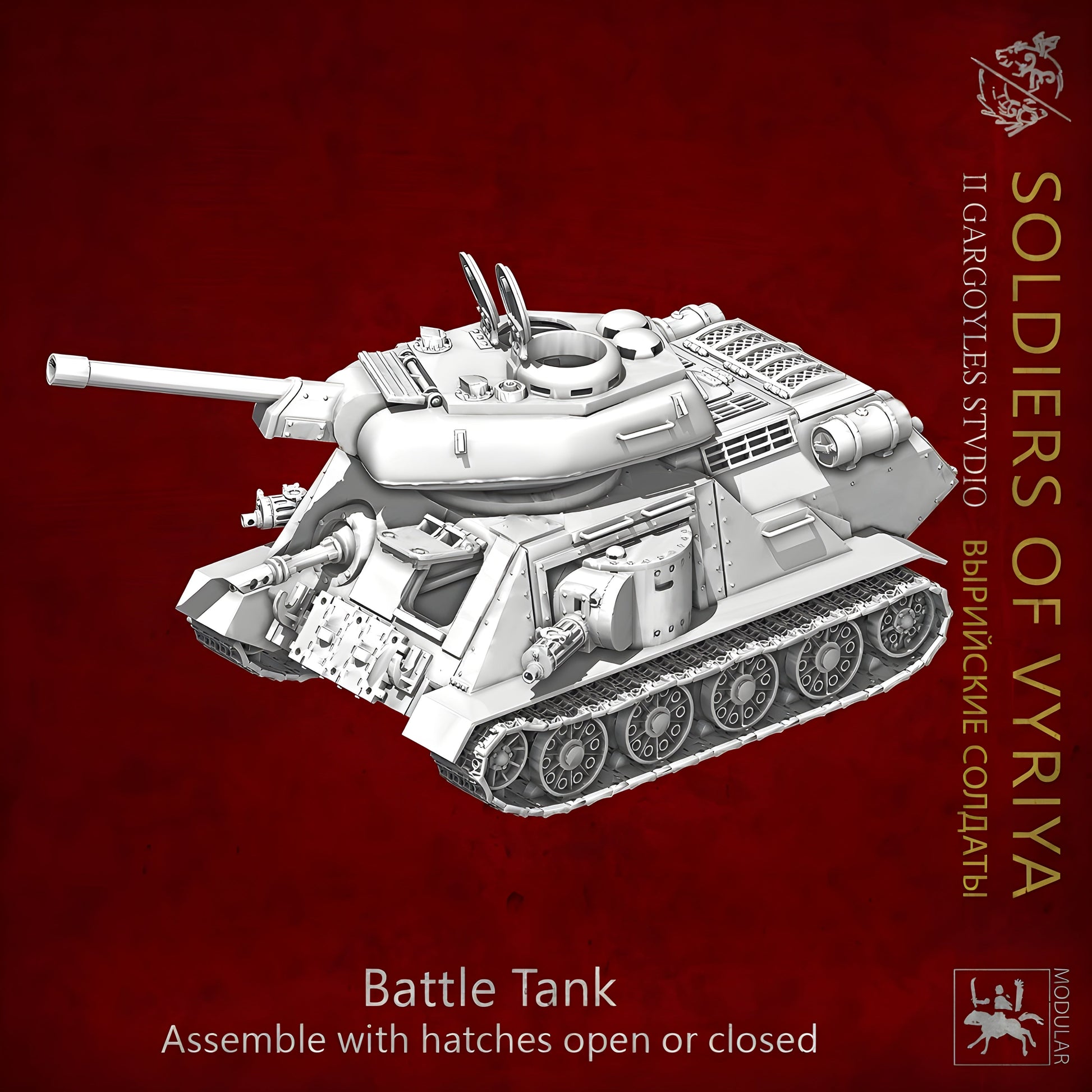 The Soldiers of Vyriya - Battle Tank packs a powerful punch with 8 different main weapons options, including a Heavy Battle Cannon and Nuclear Howitzer. It also features side weapons, such as flamethrowers and machine guns, for maximum firepower. With its flamethrower, laser cannon, and machine gun hull options, this tank is ready for any battle.